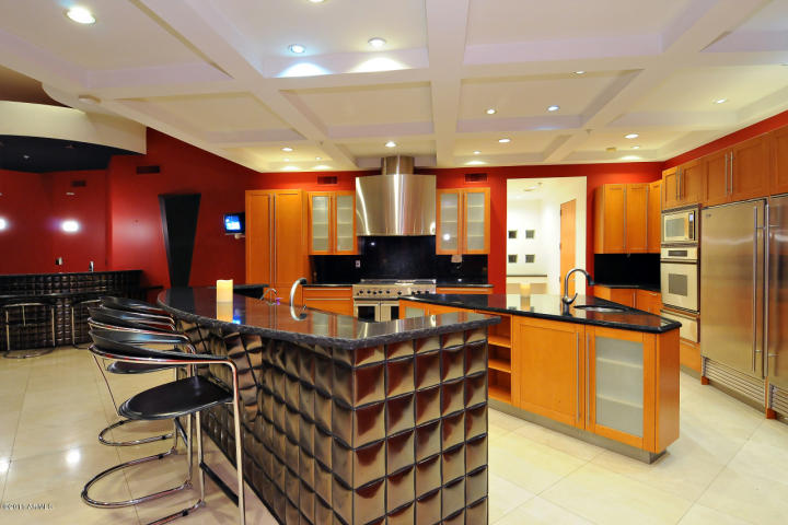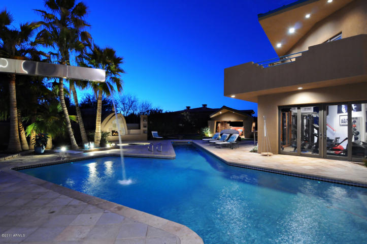 FEATURED on HGTV’s CELEBRITY HOMES: HOLIDAY DECORATING WITH THE STARS!This one-of-a-kind contemporary showplace is the perfect blend of modern style, family living and stylish entertaining. Dramatic 24’ high entry foyer with grand circular staircase & elevator lead to 2 master suites w/private patios overlooking diving pool, unique water features, connecting 62’ lap pool/spa. Gourmet granite kitchen blends into expansive family entertaining areas, butler’s kitchen & spectacular dining room. Light, open exercise room & large billiards/game room with wet bar both open to backyard mountain views. Spacious guesthouse with separate entry can double as large office. Other amenities included a gated entry, piano room, formal living, theater room, outdoor Ramada and much more!