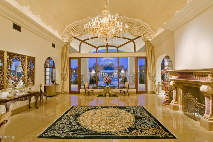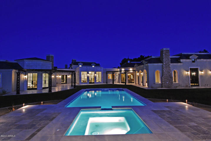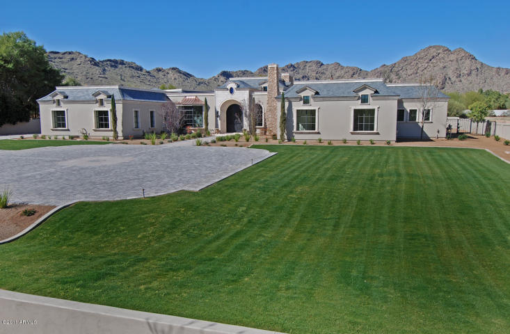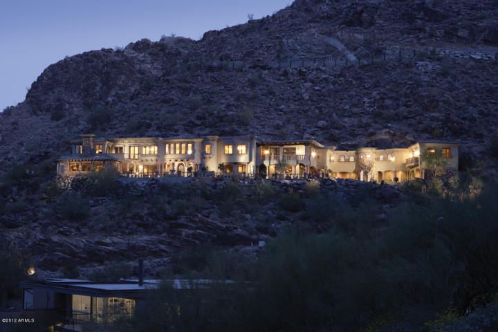 Sumptuous 5 acre estate with 35,000 sq.ft. Under roof and 25,000 sq.ft ac/heated. Incredible amenities include flooring of 6 ft. marble slabs from Italy, library with $350,000 Pierre Lang mahogany cabinetry, $1,200,000 Avia high tech security and sound equipment, a 13 seat mahogany theatre w/true movie projection and D-box chairs that move with the movie action, a luxurious master suite w/bathroom of 6 ft.onyx slabs and fabulous boutique closets, 2 swimming pools including a solar heated lap pool and 21 car garages w/$400,000 ”Show Garage”! There is also a billiard rm, wine rm, piano rm, 3 family rms, exercise rm, 2 libraries a 2 bedroom guest house, outdoor marble walkways and its own solar electric generating station hooked into APS! Lovely Mountain views with ultimate security.