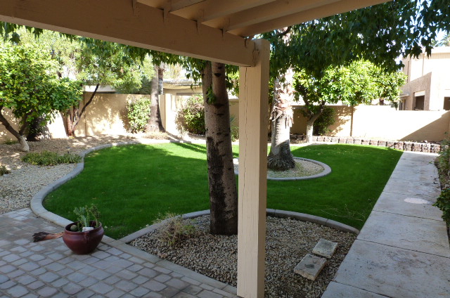 Completely updated patio home in Pointe Tapatio, which was named Phoenix Magazine’s “Best Place to Live”. Lush and secluded, with acres of mature palm trees, only 15 minutes from Downtown and a short walk to hiking, biking, and recreation at North Mountain Park. This home features new cabinetry, Corian counters in the kitchen, and tile in the full bath. The backyard is stunning, a rare find in a patio home, with grass, citrus trees, privacy, and a paver block covered patio. Inside, the charming Great Room boasts an updated beehive fireplace and wood and wrought iron railings, adding unexpected elegance.
