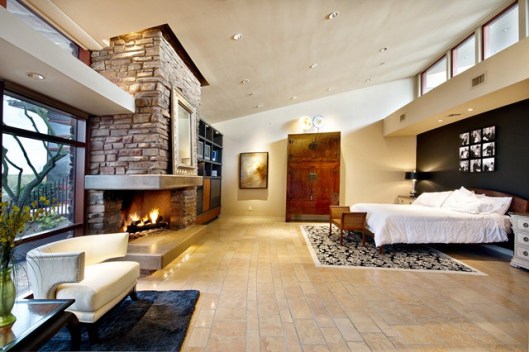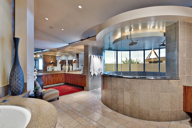 A modern aesthetic continues in the master suite, combining open space and natural materials to create an ideal place to rest. The gas fireplace provides warmth on cold desert evenings while large windows let in big views and natural light. Retreat to the master spa bathroom complete with steam room, multiple rainshowers, body spray, Jacuzzi tub, custom cabinets and luxury fixtures