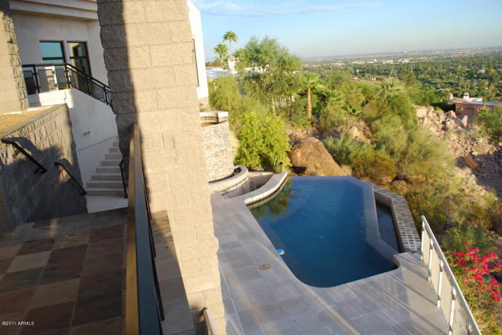 Totally remodeled home w/ city, mountain & sunset views on HUGE hillside lot nestled against the Phoenix Mtn. Preserve. Chef’s kitchen with high-end appliances spills out into dining and high balcony patios overlooking the city lights. You and your guests will love the full basketball court, endless patios, huge yard and lush landscaping. Travertine, Saltillo and 6” plank walnut floor throughout. Rich wood-colored beams on ceilings and 4 fireplaces provide a warm ambiance. Tri-split floor plan for privacy and each of 4 bedrooms has its own bath. Spacious master has large retreat with fireplace, expansive walk-in and remodeled bath w ultra Jacuzzi tub, dual head shower, Italian travertine & granite. Securely and conveniently located in prestigious guard-gated Biltmore Mountain Estates. CALL FOR MORE INFO OR PRIVATE SHOWINGS 480.458.8007