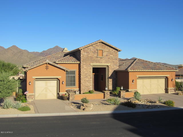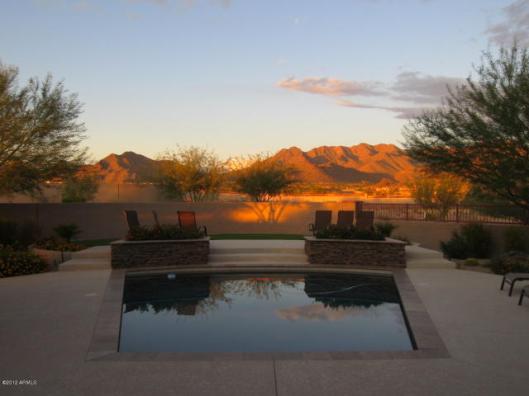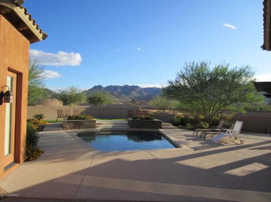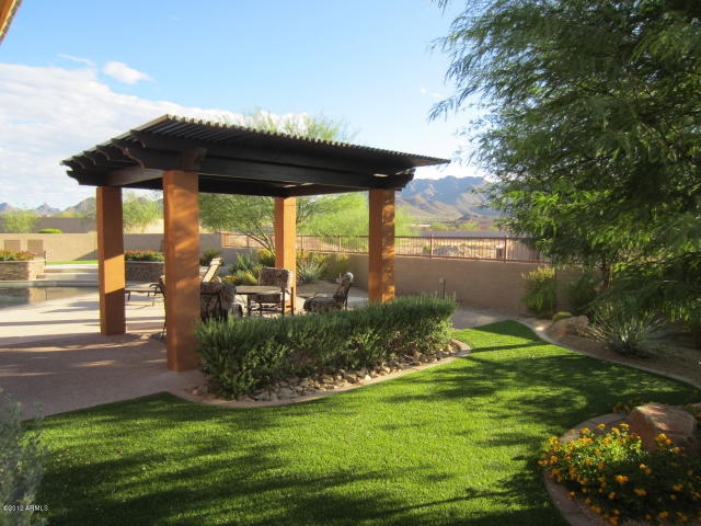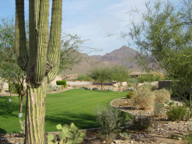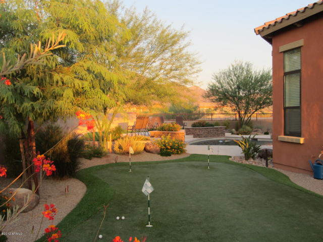 BEST VIEW IN WINDGATE! Large, premium $$ lot Pinnacle Peak and full McDowell Mtn Range view in backyard, optimum sun orientation, green belt next door and back, away from Thompson Peak Pkwy noise, extraordinary landscaping, pool with beach, two decks, covered pergola, putting green, 2 extended epoxy floor garages with door entries. Travertine flooring and granite tops throughout. Office/Den. ELAN music system all rooms, Hi-tech water filtration system; house is in IMMACULATE condition, SEE ALL PHOTOS!