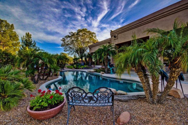 Amazing backyard with dramatic pebble finish heated pool & spa, water features, outdoor kitchen with integrated BBQ and fire pit with rock seating.