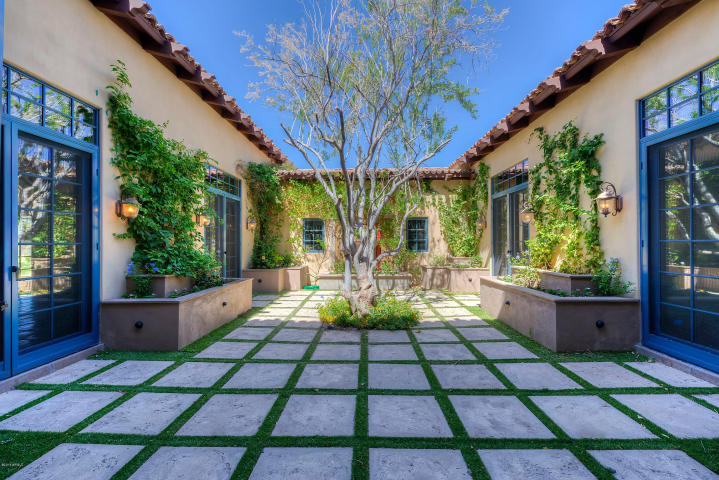 This home exudes simple elegance. Guests enter through the wrought iron gates, meander down the path surrounded by lush landscaping to the front entry. Upon entering the foyer, your first sights and sounds will be of the garden in the interior courtyard. The courtyard opens on 3 sides with French doors allowing the outside in. All the rooms are of generous size and proportions; each bedroom are en-suites with walk-in closets outfitted with Classy Closets design. In addition to the 5 bedrooms, there is a designated office downstairs and bonus room upstairs. The kitchen opens to the great room and overlooks the South facing backyard; pool, green grassy area, natural desert landscape, and mountains beyond. The master suite is tucked between 2 private courtyards. The home boasts Sub Zero, Dacor, Kohler appliances and fixtures, wood beams, Marble bathroom floors, Chink tile roofing and over 5,900 sq.ft + more…