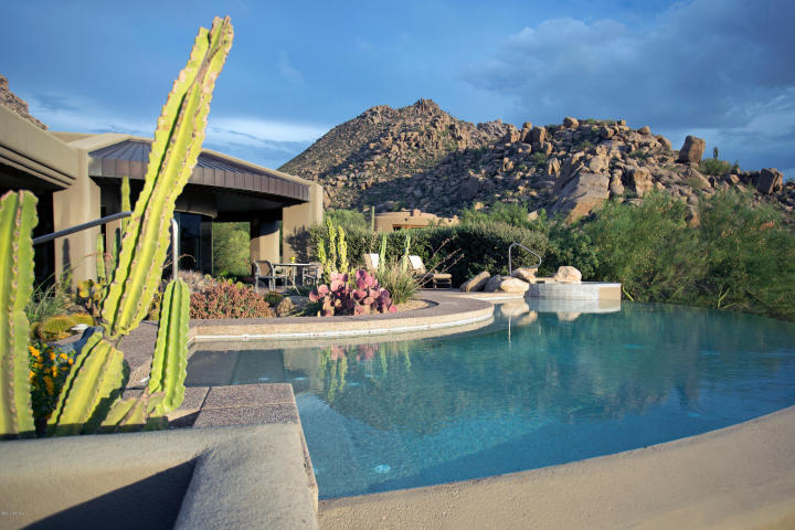 Wonderful Pinnacle Peak & Troon Mountain. Commanding City Light and Pinnacle Peak Views from this contemporary estate in guard gated Windy Walk at Troon Village.