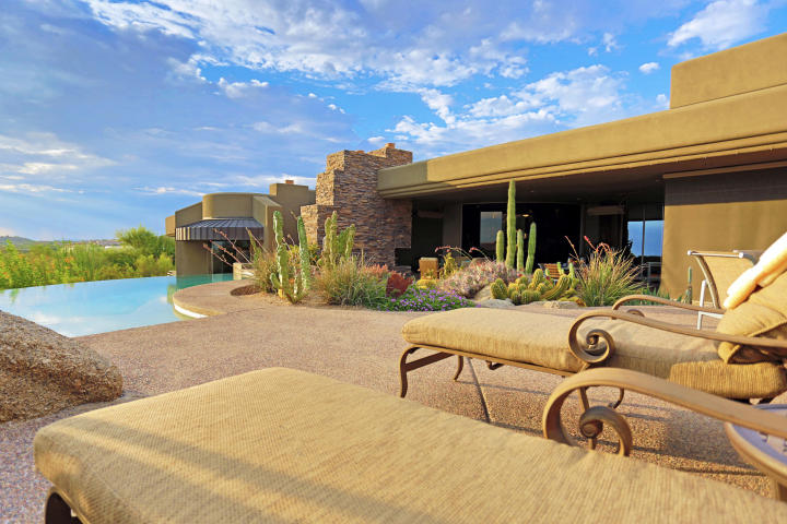 Wonderful Pinnacle Peak & Troon Mountain. Commanding City Light and Pinnacle Peak Views from this contemporary estate in guard gated Windy Walk at Troon Village.