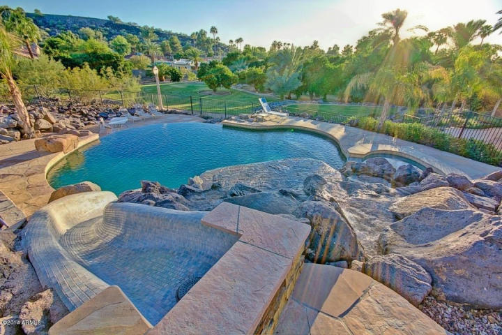 The Pristine 35,000 gallon heated pebble-tech Pool with rock waterfall and negative edge, 6-seat grotto with tunnel, tiled slide and spa is something you see on MTV Cribs and Lavish pAdZ…
