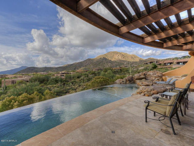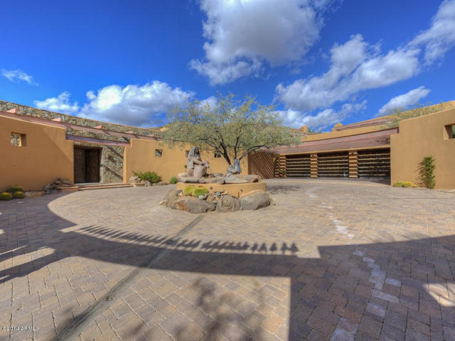 Just like his Malibu house – This Southwest Luxury Home in Desert Mountain was specifically designed and oriented to frame captivating views from every room, offering a true custom experience. Rotunda entry drive/auto court is something out of the movies; floor to ceiling butted glass walls for uninterrupted views is a no brainer; hand-laid stone accents and detailing; multiple fireplaces; chef’s kitchen with gas range plus a climate controlled wine room (Because drinking is a must); media rm; executive office; fitness area (Must bulk up); all ensuite bedrooms; interior courtyard with water feature; separate guest casita with living space (Perfect For Pepper), kitchenette, bedroom, bath & patio; flagstone decking surrounds dramatic negative edge pool; wraparound patio w seating and dining areas + built-in bbq; compelling architecture that dramatically accents desert hillside setting & panoramic views.