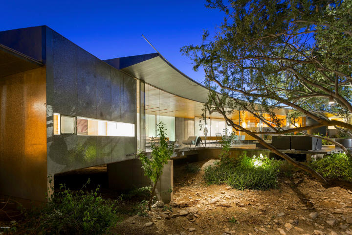 One of the most expressive designs by Architect Will Bruder, this home offers exquisite detailing with a curvilinear plan that spans over a natural desert arroyo. Known as the Desert Bridge House reflects a timeless total-design commitment. Every detail counts in this stunning masterpiece of regional architecture: bespoke design is reflected in every aspect. A luxurious lifestyle flows seamlessly from floorplan to site. The home is filled with diffused natural light, and every room opens to the sheltered panoramic view of the yard and surroundings. The attached guest house offers cooktop and bath, and there’s an impressive amount of storage including the attached 3-car garage. AWESOME!!!