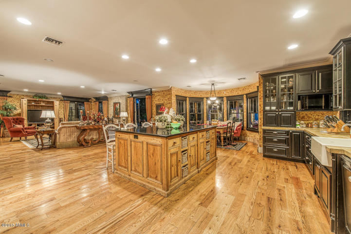 The Scoop: Located on one of the most beautiful streets in Arcadia, Arizona (DEL RAY ESTATES). Exeter Blvd features tree lined streets, unique architecture from Spanish Contemporary to Mediterranean and French chateau. But beyond all these other homes you reach this beautiful and elegant Old English style Country Estate. Working outside in you will be greeted with amazing architecture and curb appeal. Open the doors to see the attention to detail, from the thick wood crown molding and wainscoting to the custom doors and windows to the built-in bench under the stairway. Perfection comes to mind! The specs include 5 Bedrooms, 7 bathrooms, 7,619 sq. feet, and a formal dining room with gas fireplace – oh look closer and see if you can find the hidden wine service fridge. A cook’s kitchen that even Chef Ramsay would admire.