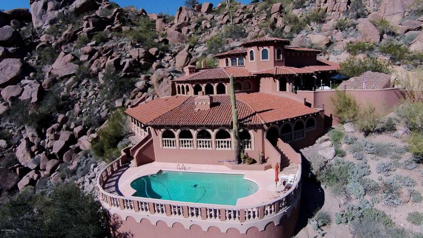 Perched high on 1.64 acres on Black Mountain with sweeping city light views and overlooking the Boulders Resort & Golf Course. The three-story villa features 4 bedrooms, 6 bathrooms, 6,071 SQ.FT, 2 car garages, gourmet kitchen, wood bar, outdoor and indoor fireplaces, patios and wrap-around porticos, and a pool sitting at the edge of the villa. Once priced as high as $3.5 million, now asking a fraction at $1,995,000.
