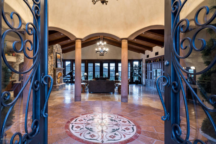 Complete with Exquisite finishes throughout such as: wood-beamed ceilings, Venetian plaster walls, Italian tile flooring, carved Cantera accents and extensive wrought iron detailing.