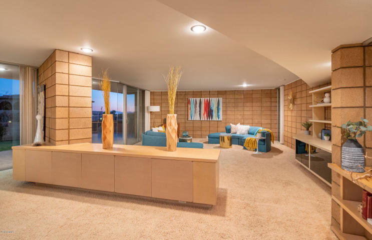 The house is masonry construction showcasing a high level of craftsmanship with details that include a custom steel facia, mahogany millwork and custom built-ins. A curved “loggia” follows the path to the entry providing detail, shadow and a covered respite from the elements. Nearly original save for a few cosmetic updates, the plan has remained unchanged. Floor to ceiling glass and doors connect the home solidly to the outdoors, yet all are sheltered with generous overhangs that make this home desert-appropriate modernism.