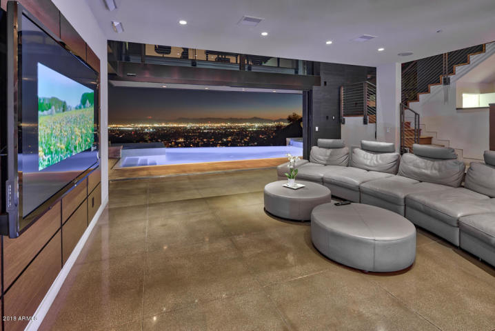 A Magnificent Contemporary Glass see -thru Retreat high on Camelback Mtn which looks at fabulous Boulders nestled right outside the glass walls in the back, and panoramic City Light Views flooding the front. Disappearing Walls of Glass open to rock waterfalls, a barbecue, fireplaces, a negative edge pool, spa and cabana with TV. A glass 2 story Euro-kitchen has 2 center islands with Miele appliances and a projector that casts photos directly onto its 2 story walls. A private bridge from the house to your own private trailhead will have you hiking in minutes. There is an amazing glass master bathroom that abuts Boulders and has an outdoor walkway to an outdoor shower. This piece of living ART is a smart home with a soul! The property is both in Paradise Valley and Phoenix!