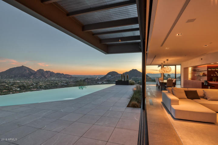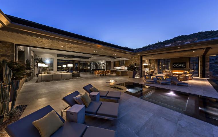 Selling for $9,300,000: STUNNING CONTEMPORARY ESTATE nestled into a gated, private 10-acre reserve in Desert Mountain’s upper ”Canyon” neighborhood provides unparalleled, forever views of the Valley, Sunsets and City Lights. Disappearing glass walls with a 45′ span open from the Great Room, Master Retreat and 1050 SF AZ Room onto a resort patio that includes a 25 meter infinity lap pool, wall of rain & linear fire pit. One-level main home boasts Great Room, Modern Chef’s Kitchen. dramatic Wine Wall & Bar, Master Suite and Library. Guest Sing houses 4 exceptional Guest Suites, Media/Family room and a dramatic floating staircase – w/ 22ft high picture window and crystal orb pendants *Sold furnished*Today’s Decor*Solar Panels*Elevator*Radiant Floors*4 Car Garage*Control 4-Smart House*Audio/Video throughout*… Listing Agent – Kathleen Benoit Russ Lyon Sotheby’s International Realty