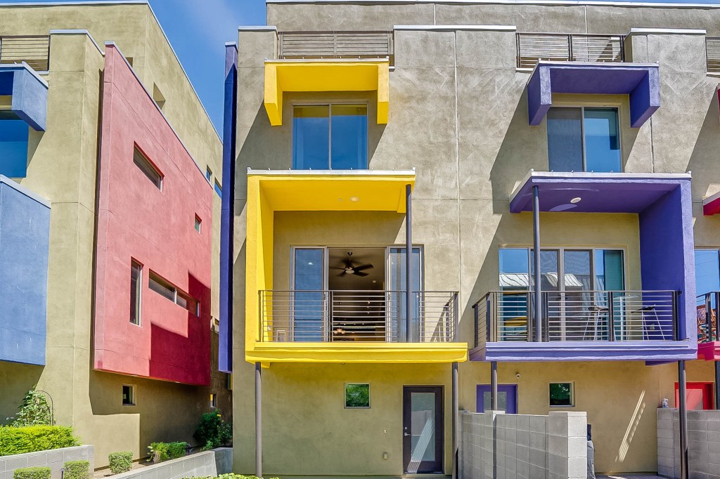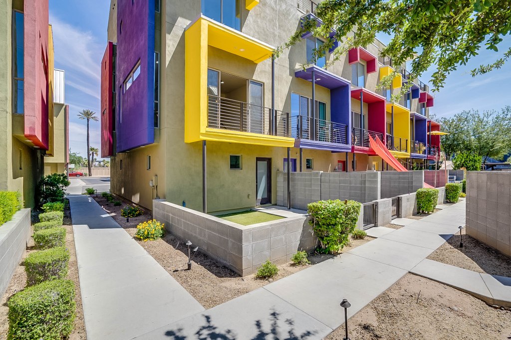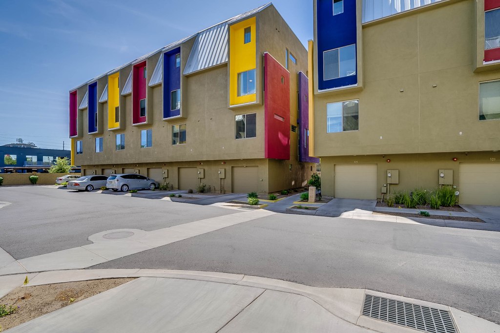When initial renderings for this 25-unit townhome development in Downtown Phoenix’s Evans Churchill neighborhood (a vintage – yet new downtown phoenix neighborhood) within Roosevelt Row emerged 13+ years ago, nearby neighbors applauded the project as being “sexy with a colorful twist” and the sort of infill that Phoenix needs. It was one of the early new historic revitalization projects that helped reshape the skyline and generated a buzz about the area from skid row to an increasingly attractive place to live, work and play!