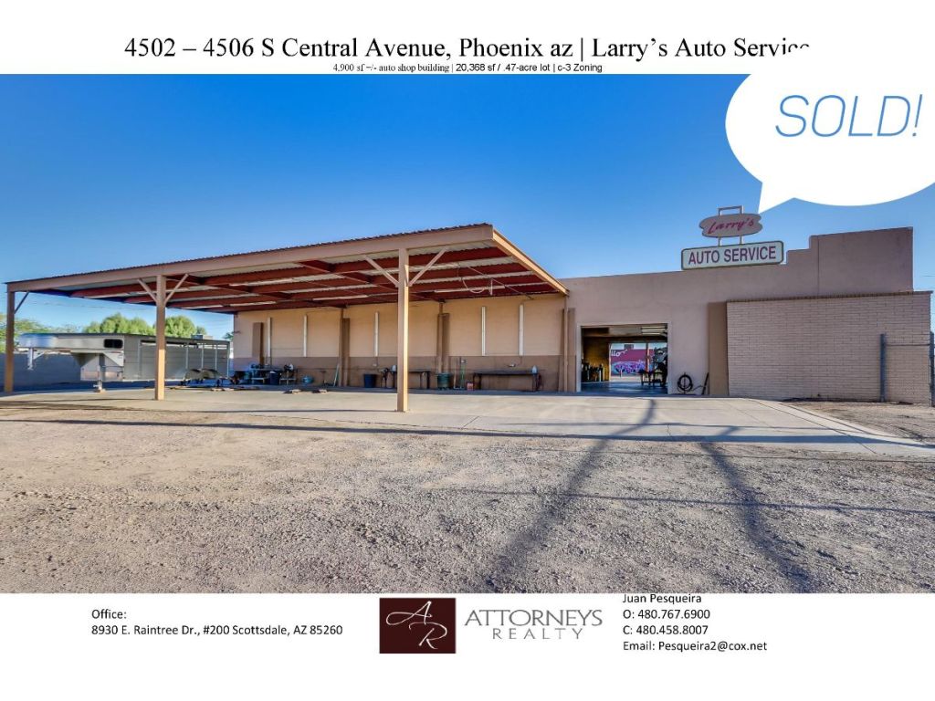 SOLD in 9 months/98% from full asking price… Auto Mechanic/body shop building! Amazing hard to find C-3 zoning along Central Avenue. Comprised of 3 different parcels totaling 20,368 sf / .47-acre lot being sold as one. The 4900 +/- building, known as LARRY’s AUTO SERVICE has been a successful business for 40+ years. This Solid block old school auto mechanic/shop building has Central Avenue frontage of 180 feet +/-. Highly traffic location, with easy access/exit for any business who operates in this location. The building itself features 12 ft ceilings, wired with three phase electricity including air compressor. There are three single post inground lifts, three post twin inground lifts, fronted alignment rack, plus ample room for work benches and tool boxes. The shop entrance has a pull through, one sliding door (north side) and 10ft roll up door (south side). Access to both front and back locks through the shop or through both gates. Back lot has attached steel canopy covering three lifts. The shop also has a waiting room, public & private restroom, employee breakroom, compressor room, and office. The back office has separate entrance. The c3 zoning allows for many uses/developments. The current building is turnkey for a car repair shop business owner/end user + has 8 camera security system in place. It’s also an excellent opportunity for a rental income producer or for future development. The two lots to the south of the subject are owned by city of Phoenix in which have expressed they would like to sell.