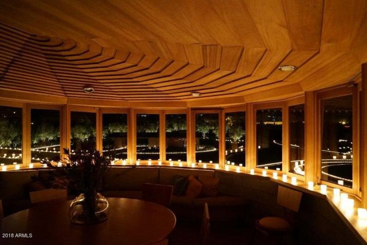 Impulsando tres dormitorios y cuatro baños, una sala de estar circular y un comedor. Muro de ventanas redondeadas con vistas a una terraza y al hermoso paisaje desértico. La cocina cuenta con encimeras curvas. Una casa de huéspedes tina de 360 pies cuadrados se encuentra en el extremo más alejado de la propiedad …