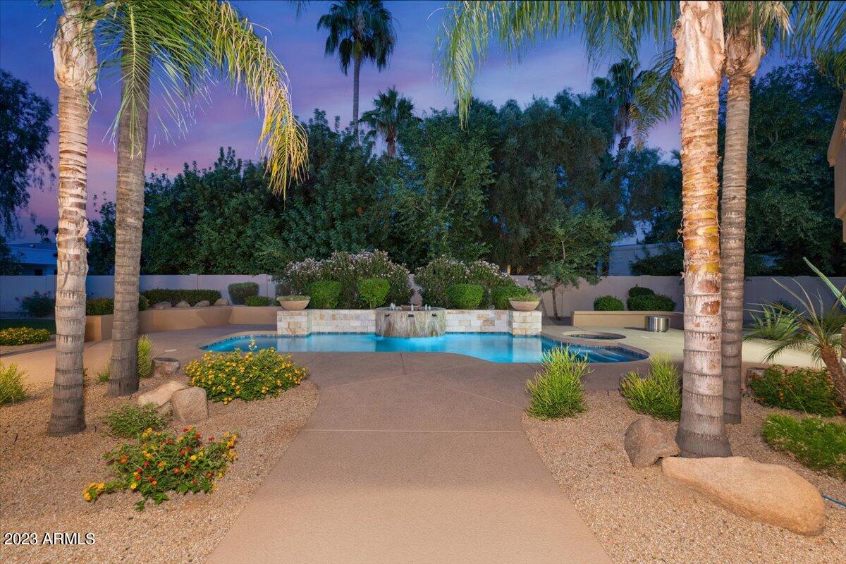 Entertainment possibilities abound both indoors and outdoors. The estate features a bedroom wing with three bedrooms and baths, along with a generous living space perfect for study desks or a TV gaming area. Stepping outside, the captivating backyard beckons with a dreamy pool, fountains, a relaxing spa, an expansive patio, and an impressive sports/basketball court. Golf enthusiasts will appreciate the meticulously maintained putting green. Additional highlights include a walk-in wine cellar, a detached casita with its own bathroom, and low-maintenance turf that ensures a stunning outdoor landscape with minimal upkeep.