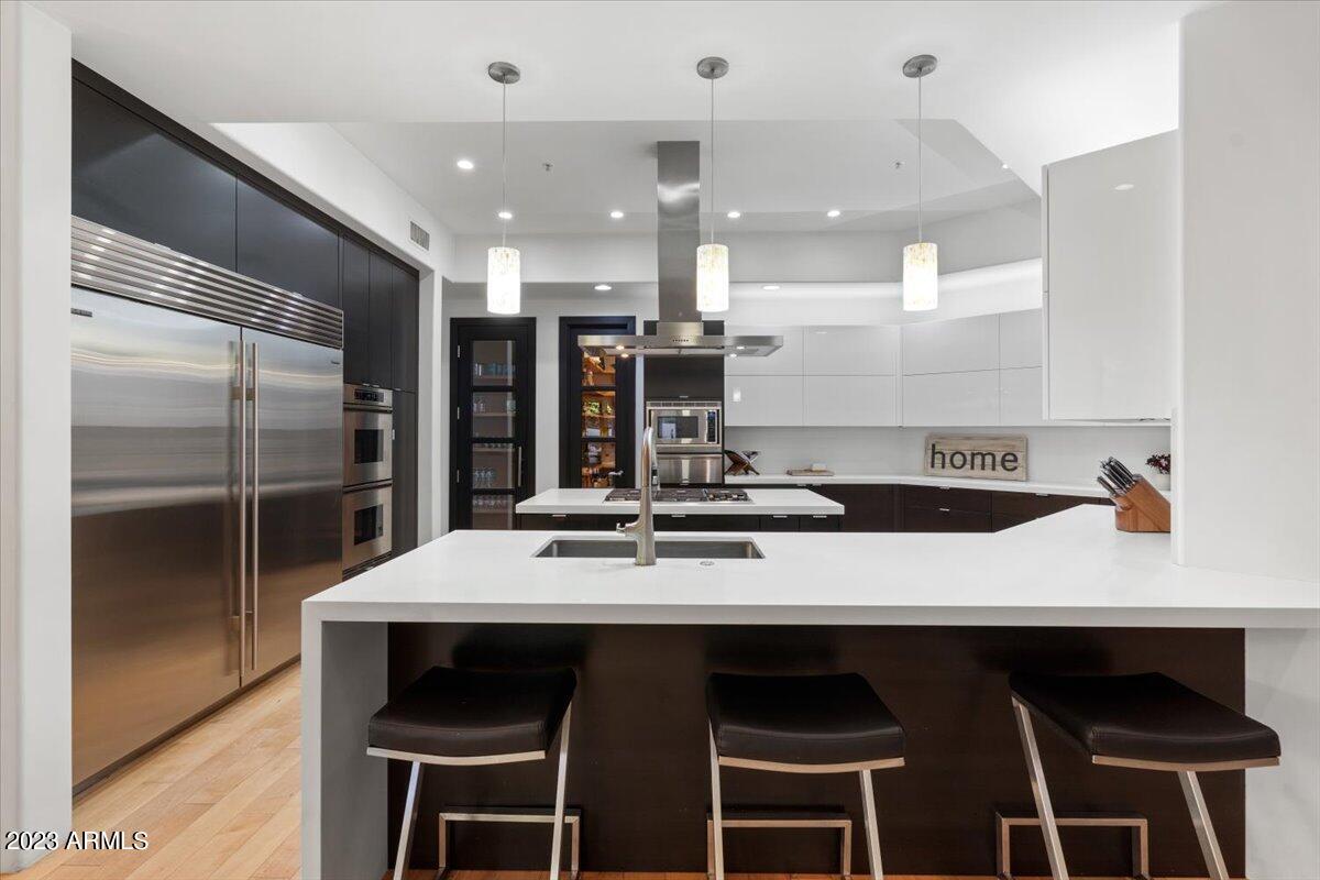 Upon entering, the dramatic entryway reveals a posh split floor plan that emphasizes privacy. The owner’s suite is a sanctuary of tranquility and sophistication, featuring a wet bar, floating cabinetry, modern finishes, and stone surrounds reminiscent of a high-end spa. The opposite side of the house boasts a beautiful modern kitchen equipped with top-of-the-line stainless steel appliances, automatic open and close high gloss cabinets, and a spacious butler’s pantry with ample storage.