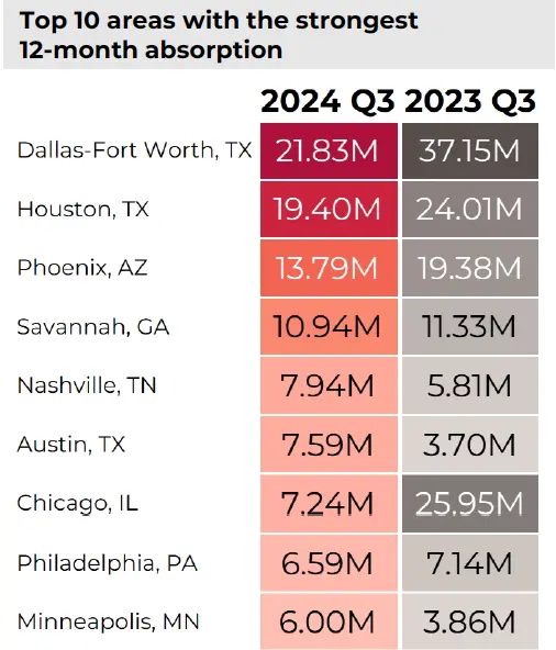 Phoenix también está entre las 10 principales áreas en absorción de propiedades industriales, aunque no está tan caliente como antes. En el tercer trimestre de 2024, se absorbieron 13.79 millones de pies cuadrados de espacio industrial, frente a 19.38 millones de pies cuadrados en el tercer trimestre de 2023. Esto refleja la tendencia nacional de enfriamiento en el mercado industrial. Sin embargo, con las tasas de interés que se espera disminuyan, la demanda de bienes podría aumentar, lo que podría generar un renovado interés en los espacios industriales.