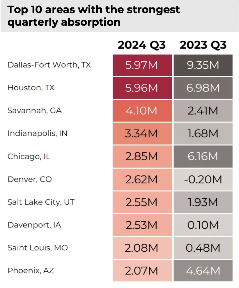 The industrial sector, though still strong, has started to lose some steam. Nationally, rent growth has slowed significantly, and the vacancy rate has edged up to 6.6% due to an increase in new supply. Phoenix, however, continues to be a hotspot, with a quarterly absorption of 2.07 million square feet—a strong indication that demand for industrial space remains high locally, even if the pace has slowed.