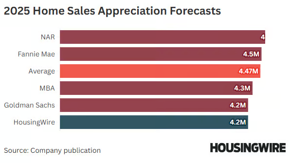The 2025 forecast for home sales points to a slight recovery, with 4.47 million sales expected. Here’s what different organizations predict: