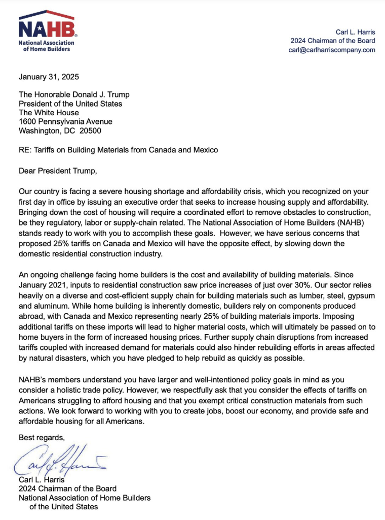 In a recent letter to President Trump, the National Association of Home Builders (NAHB) expressed their concerns over the newly announced 25% tariffs on building materials from Canada and Mexico. These tariffs, they argue, could have a significant impact on the housing market, exacerbating the already critical housing shortage and affordability crisis.